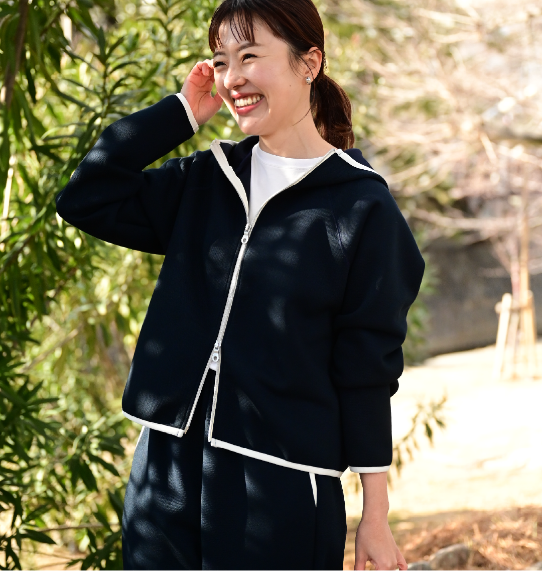 ダブルファスナー仕様で、裾を少し開けるとすっきり見えます。