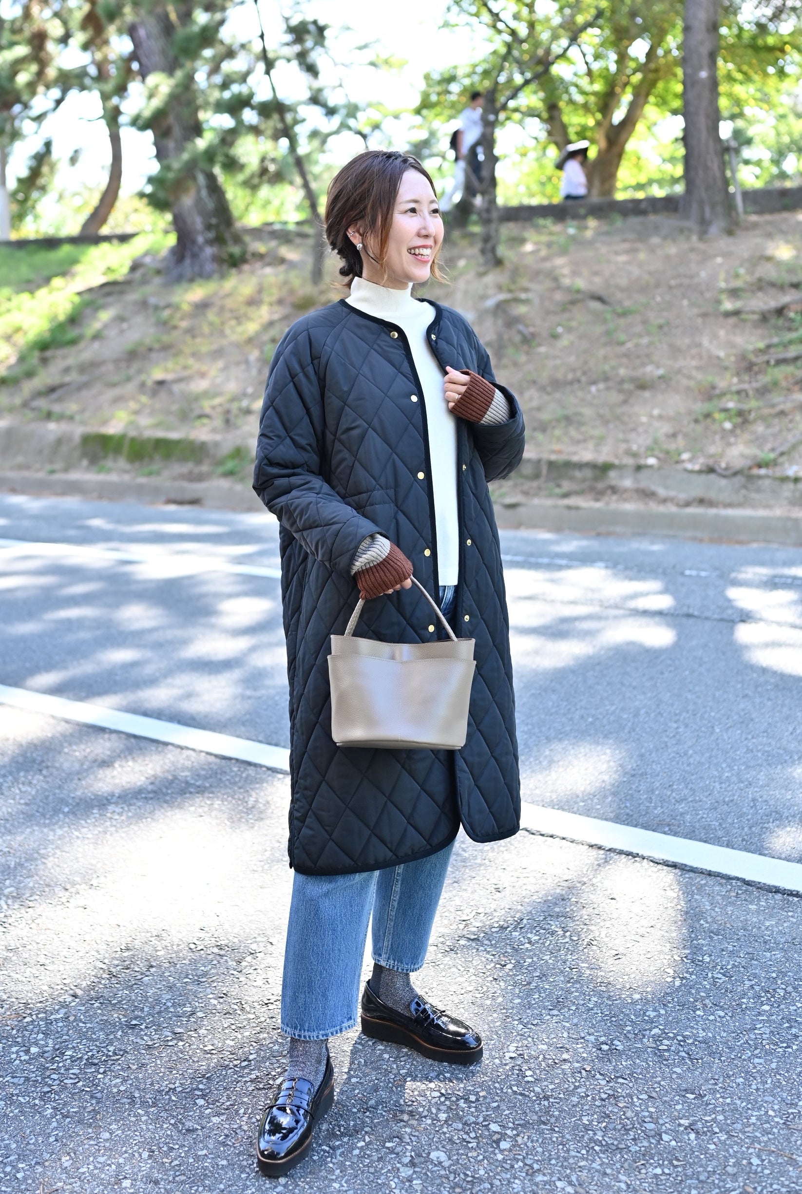 【カカオブラウン×ベージュ】「中綿キルティングコート」 「洗えるハイネックニット」 「こだわりシルエットのデニムパンツ」「こだわりレザーのポットバッグ」 「シアーラメ靴下」 「エナメルレザーのローファーシューズ」