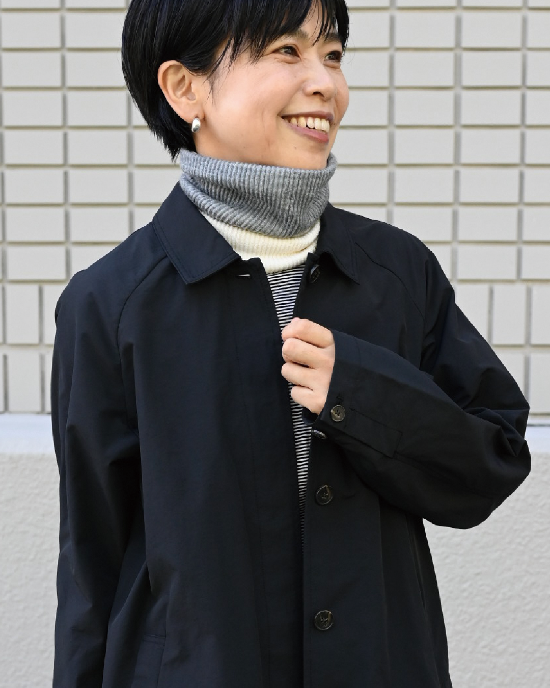 「杢グレー×エクリュ」 「撥水素材のステンカラージャケット」「クルーネック長袖カットソー」