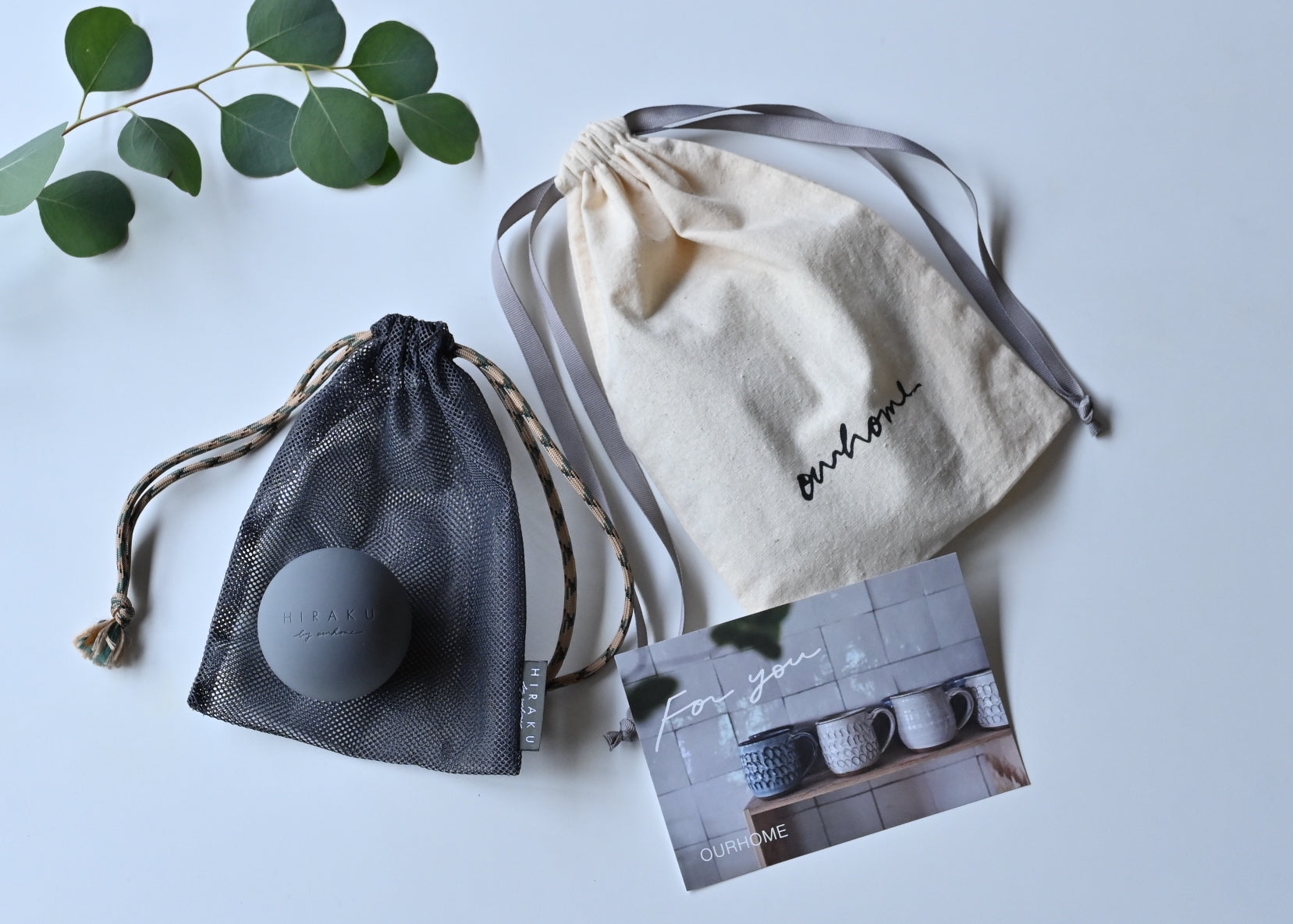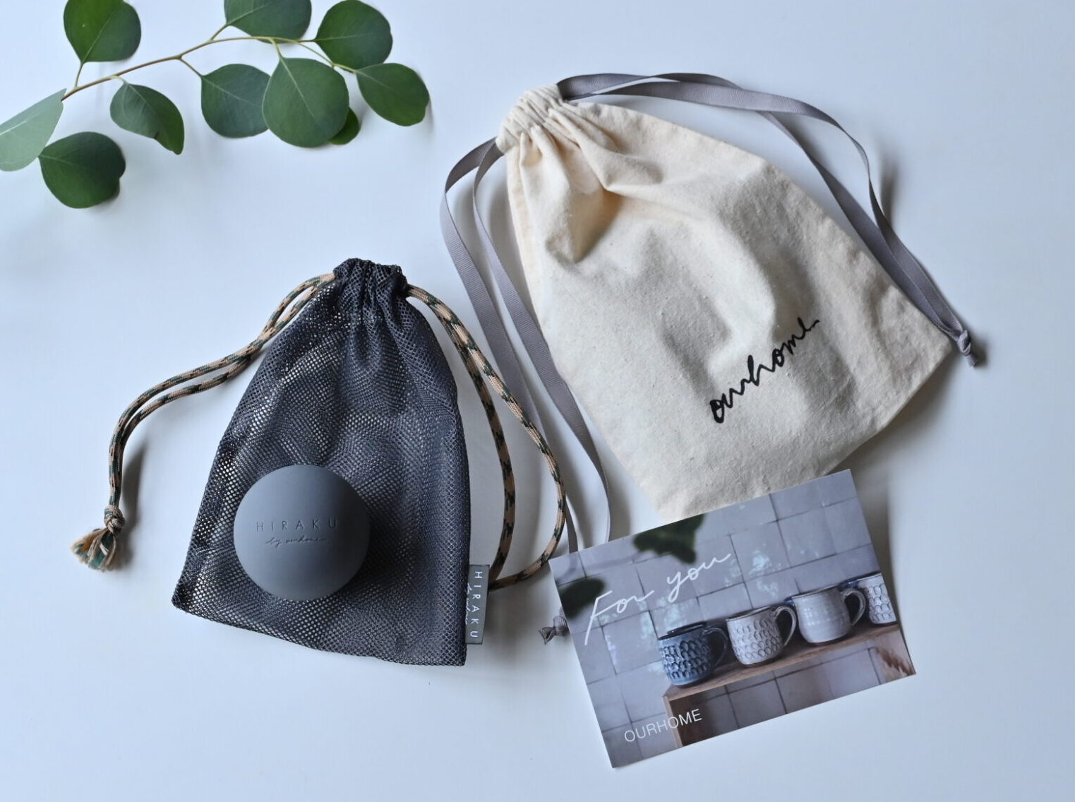 H I R A K Uタグのついたオリジナルの巾着袋に入れてお届けいたします。