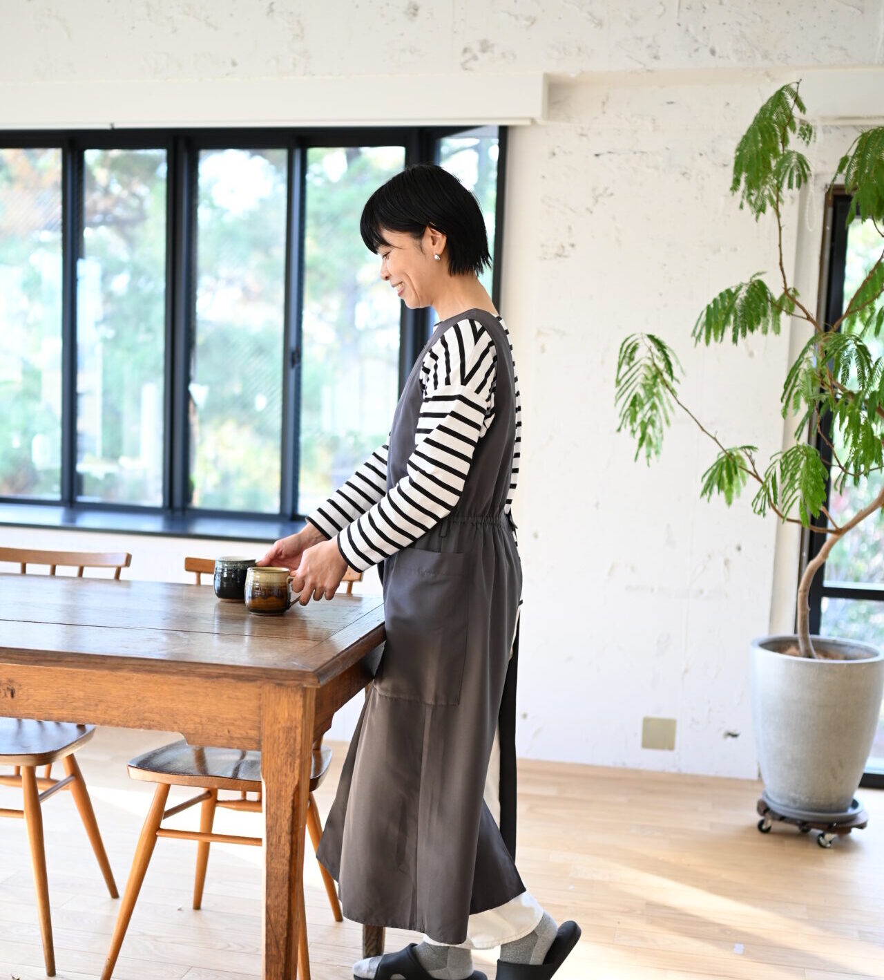 発売以来ご好評いただいている「ワンタッチで着られる、シワになりにくいエプロン」