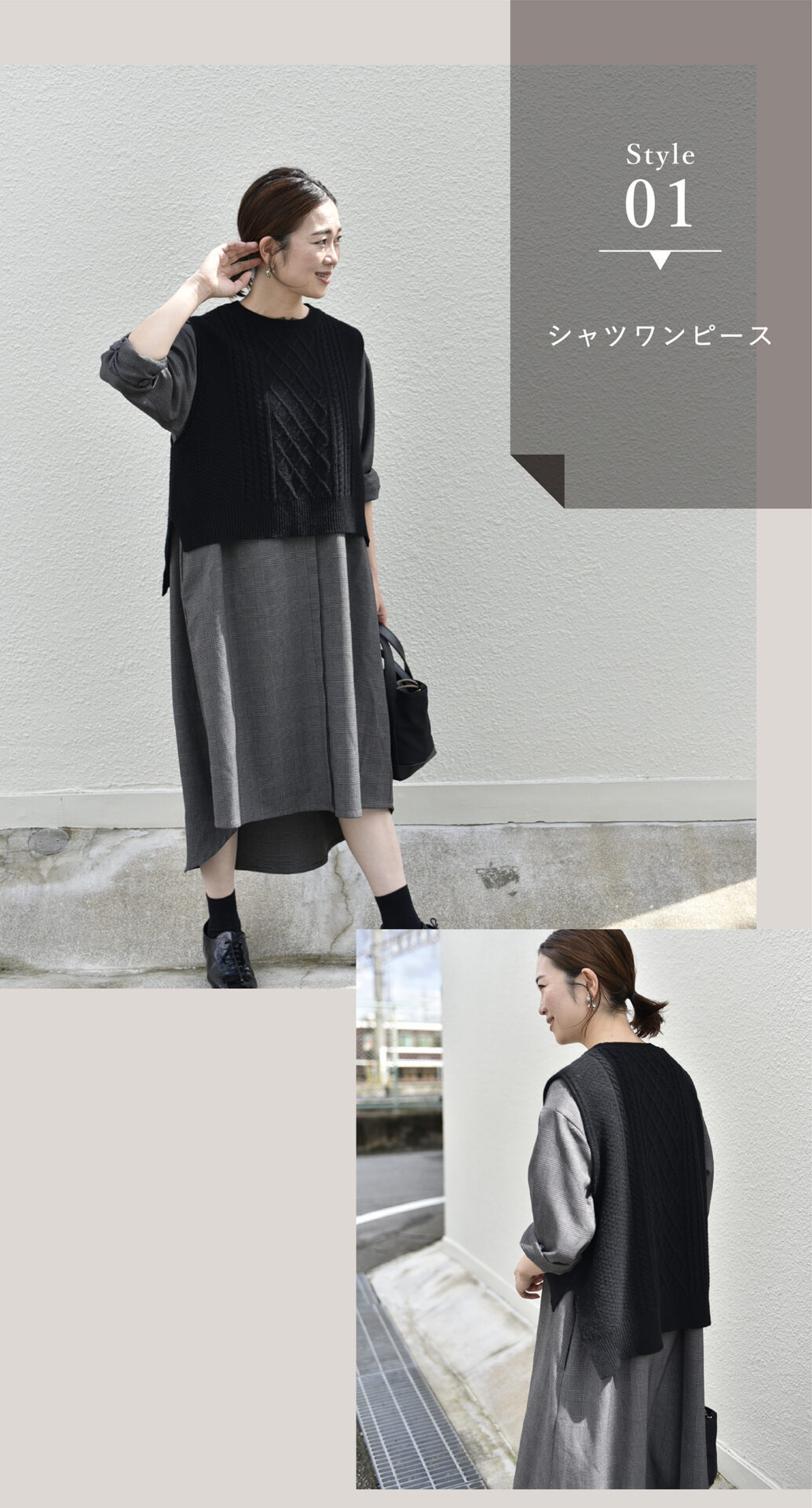 【ブラック】Emi/身長164cmシャツワンピースにベストを重ねて。