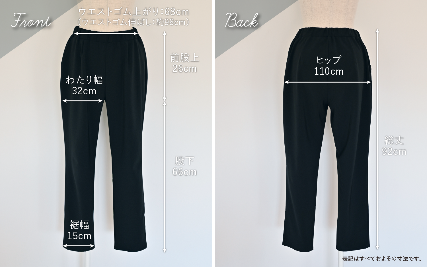 | ●Sサイズ/ウエストゴム上がり:約62cm 、ウエスト最大伸び寸:約92cm、 ヒップ:約104cm、わたり幅:約30.5cm、股下:約64cm、総丈:約90cm ●Mサイズ/ウエストゴム上がり:約68cm 、ウエスト最大伸び寸:約98cm、 ヒップ:約110cm、わたり幅:約32cm、股下:約66cm、総丈:約92cm *平置き・メジャーでの採寸ですので若干の誤差はございます。 |