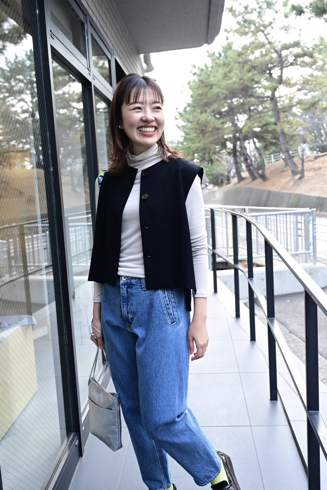 【グレージュ】スタッフ池畑/身長159cm「洗えるボタンベスト」「こだわりシルエットのデニムパンツ」「フィットショルダーバッグ」「汚れが目立ちにくい靴下」