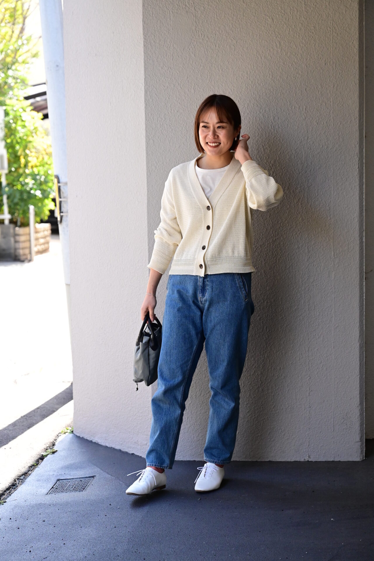 【ホワイト】スタッフ山崎/身長161cm「洗えるざっくりコットンニットカーデ(3月下旬発売予定)」「こだわりシルエットのデニムパンツ」「マシュマロコンフォートシューズ」「レザー持ち手のパンダショルダーバッグ」
