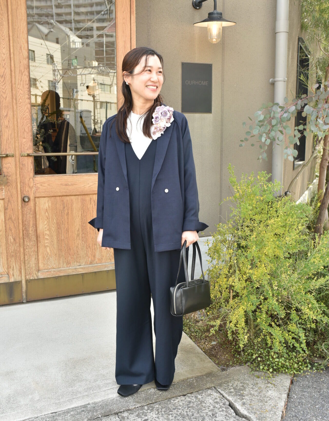 【ダークネイビー】スタッフ於保/身長156cm「洗える軽やかジャケット」「コットンボイルブラウス」「ハレの日コサージュ」「艶やかレザーのキューブバッグ」「ストラップシューズ」