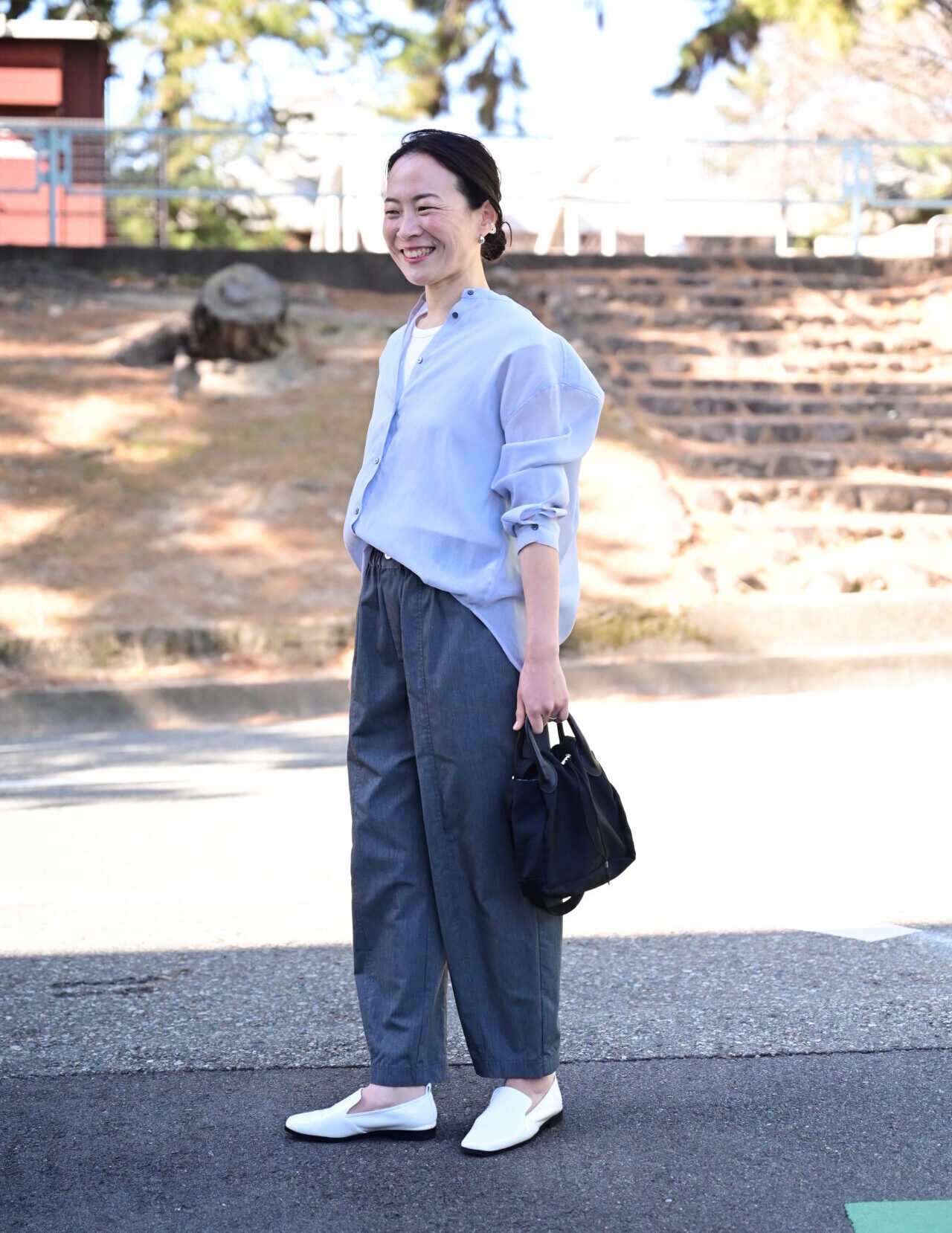 【ホワイト】Emi/身長164cm「シワになりにくい、1年中はけるコクーンパンツ」「アフリカパーニャ生地の巾着バッグ」「ナイロントートバッグ/medium」「エナメルレザーのローファーシューズ」