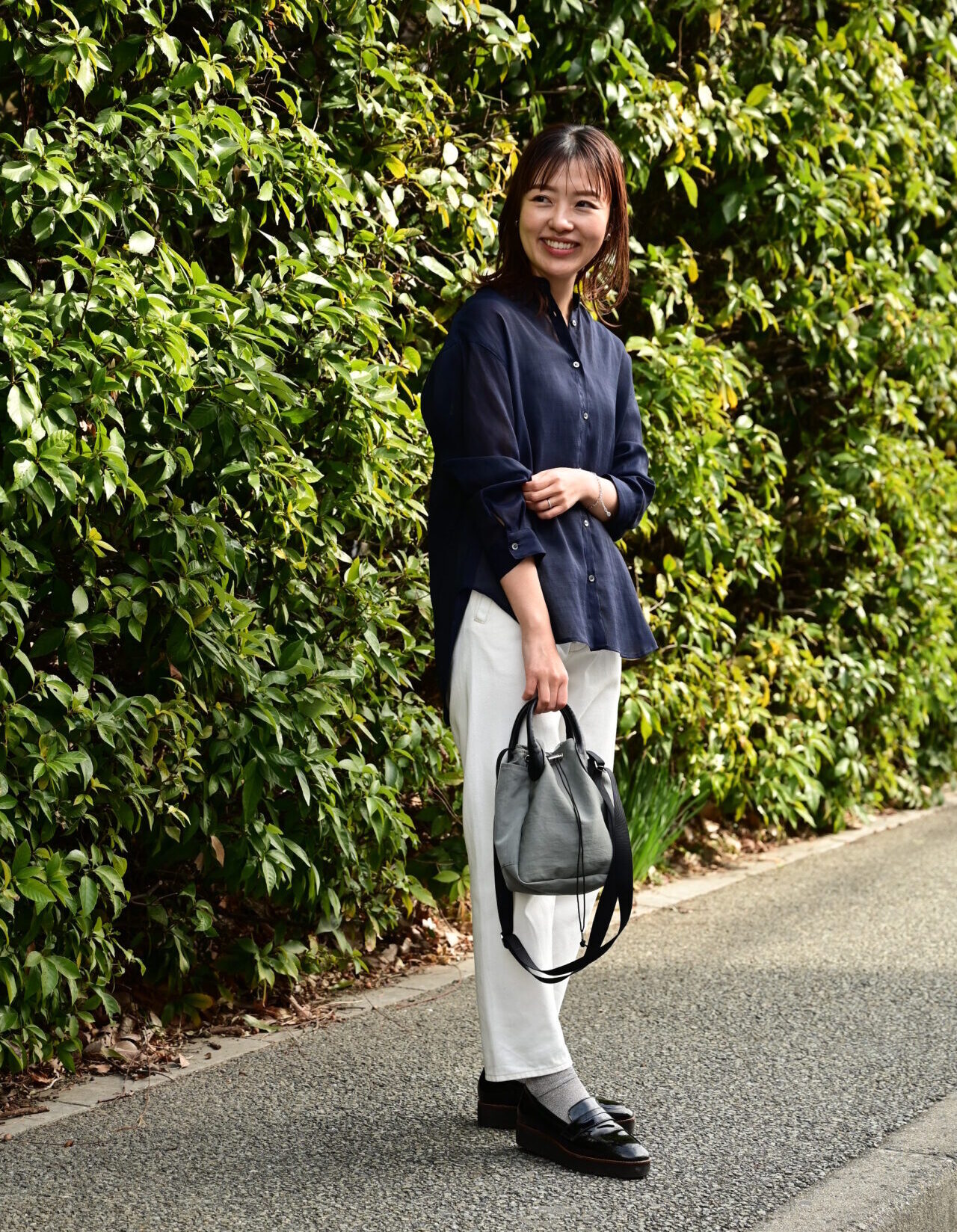 【ダークネイビー】スタッフ池畑/身長159cm「こだわりシルエットのデニムパンツ」「レザー持ち手のパンダショルダーバッグ」「エナメルレザーのローファーシューズ」