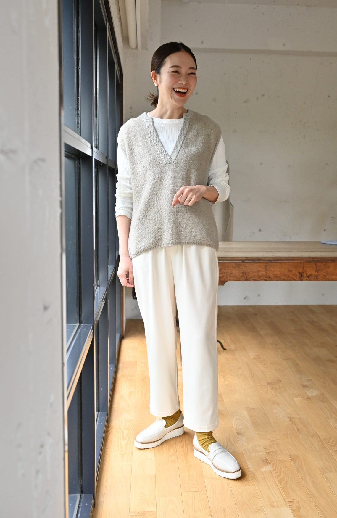 【グレーベージュ】Emi/身長164cm「ツヤ感素材の長袖カットソー」「ゆるテーパードの裏起毛あったかパンツ」「エナメルレザーのローファーシューズ」「配色ラインのリブ靴下(11月下旬発売予定)」