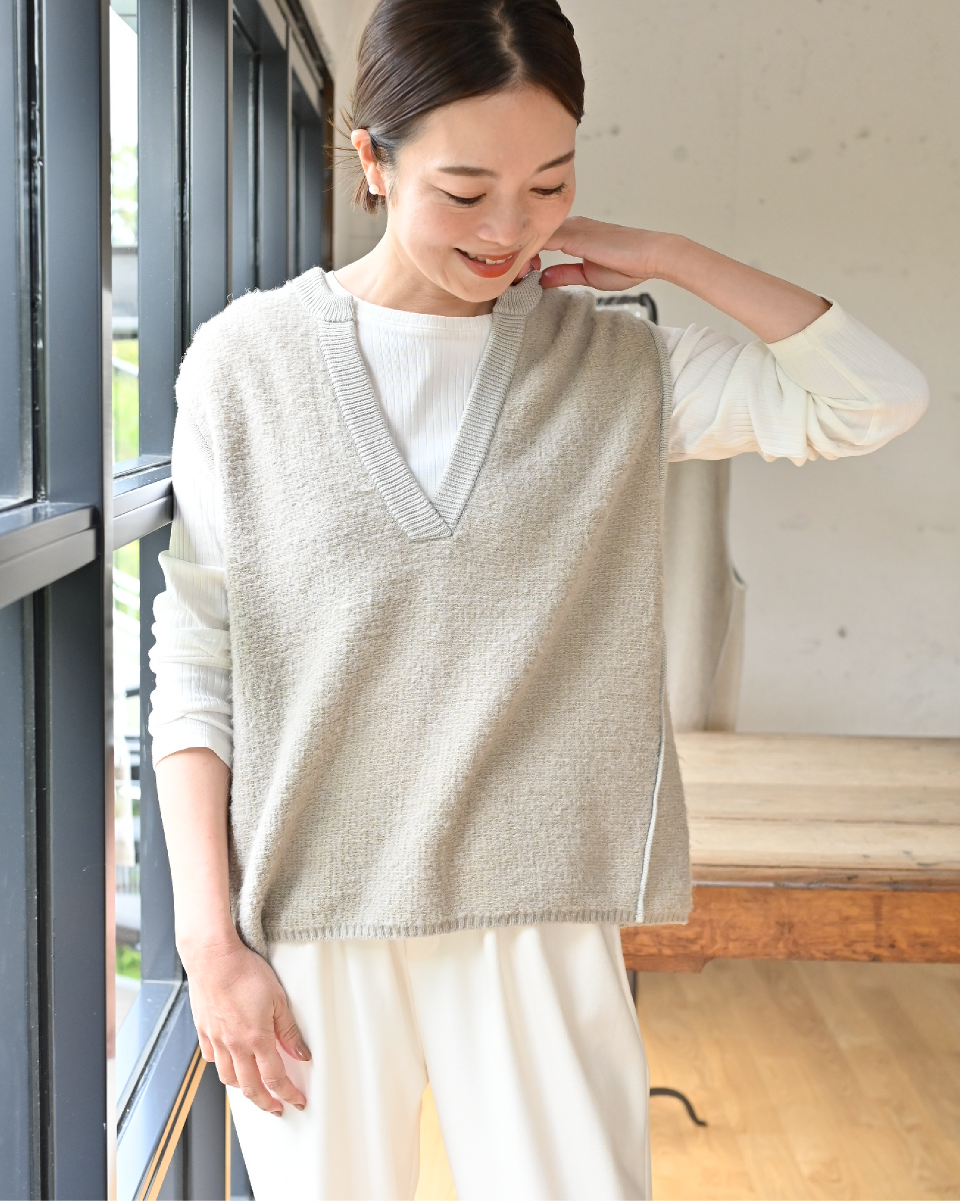 深めのVネックで顔まわりすっきり。