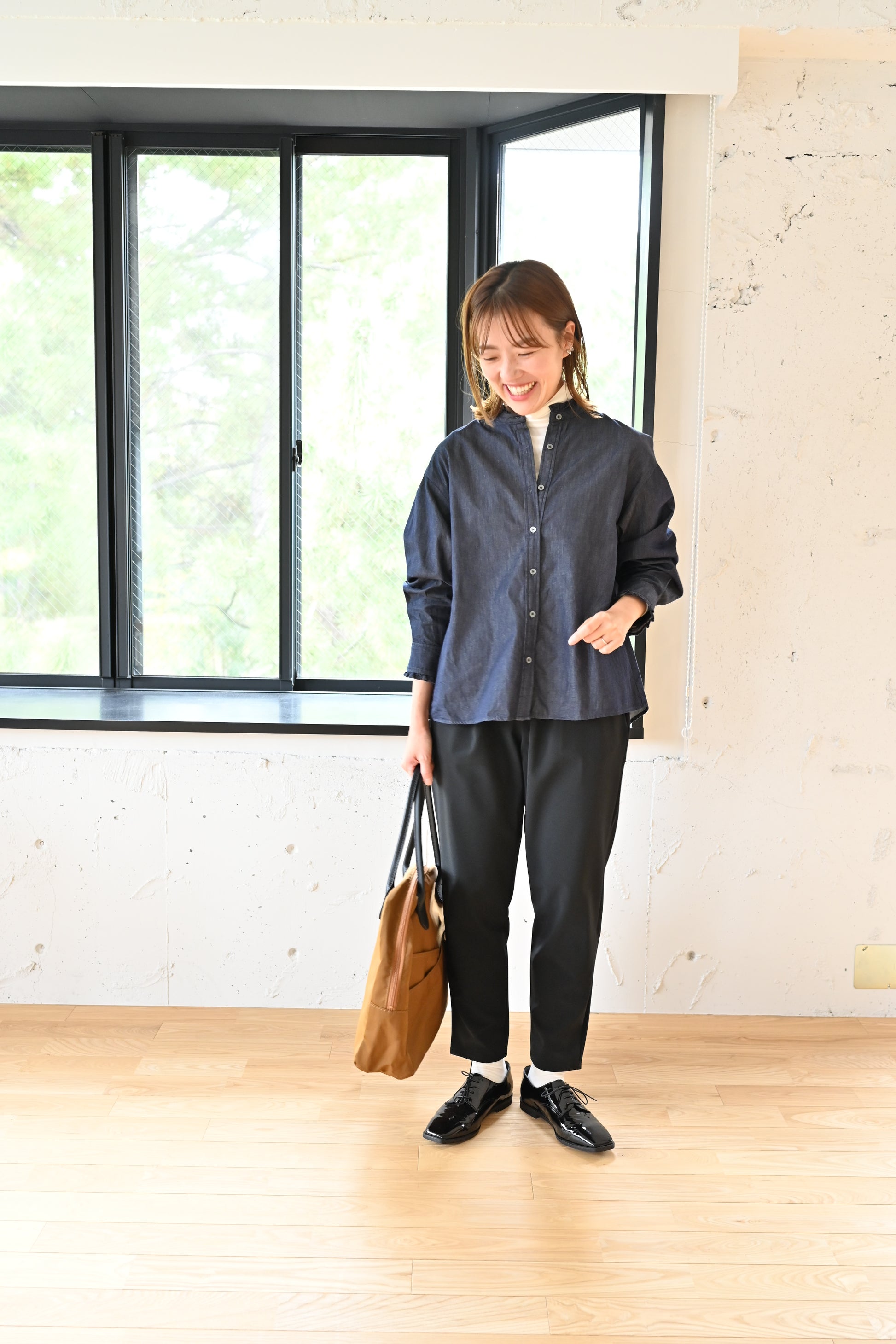 【ダークネイビー】「ゆるテーパードの裏起毛あったかパンツ(10月発売予定)」「こだわりレザーのポットバッグ」「エナメルレザーのローファーシューズ」「シアーラメ靴下」