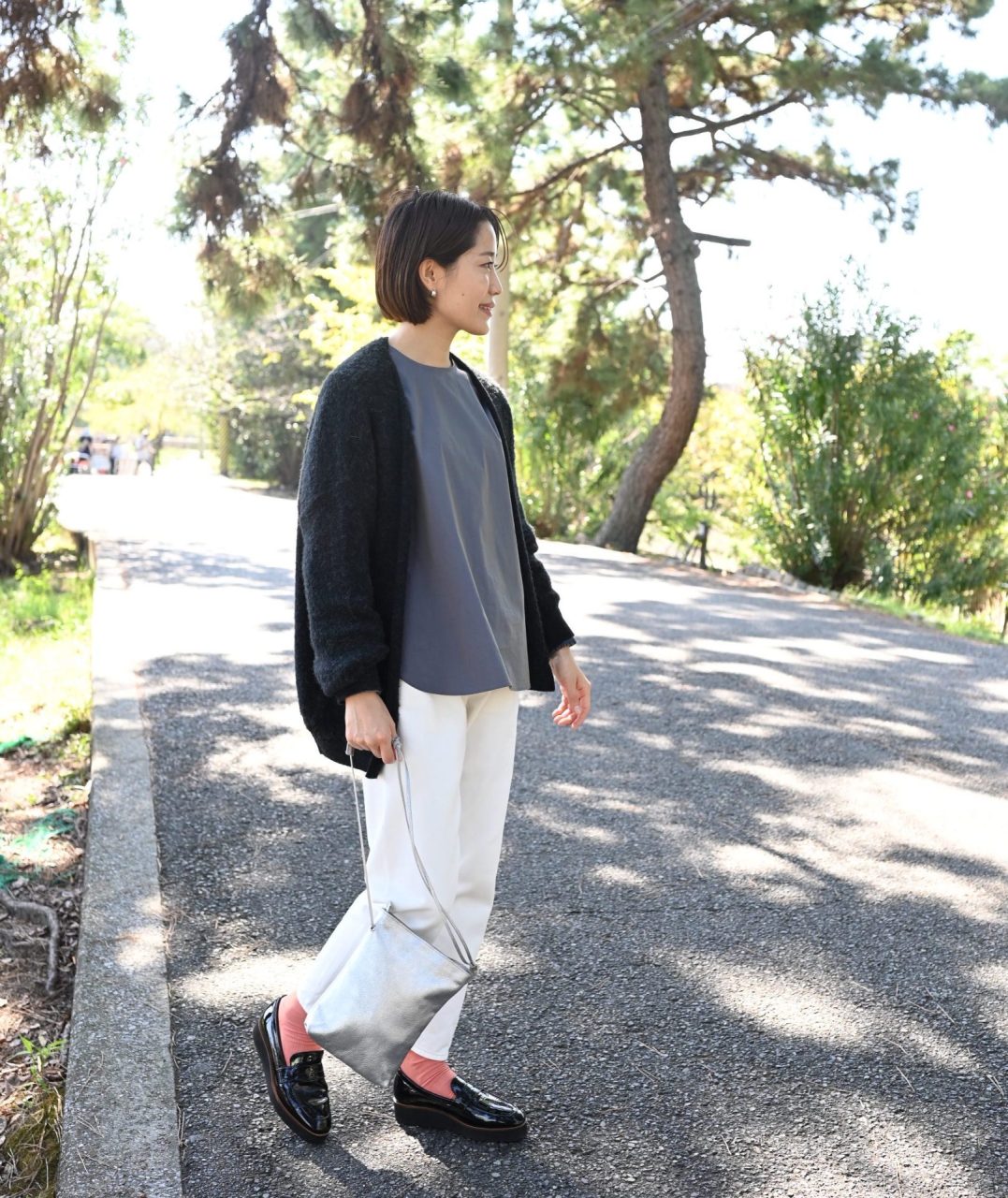 【オーロラグレー】スタッフ澤村/身長163cm「アルパカ混ふんわりニットカーディガン」「こだわりシルエットのデニムパンツ」「フィットショルダーバッグ」「エナメルレザーのローファーシューズ」「配色ラインのリブ靴下(11月上旬発売予定)」