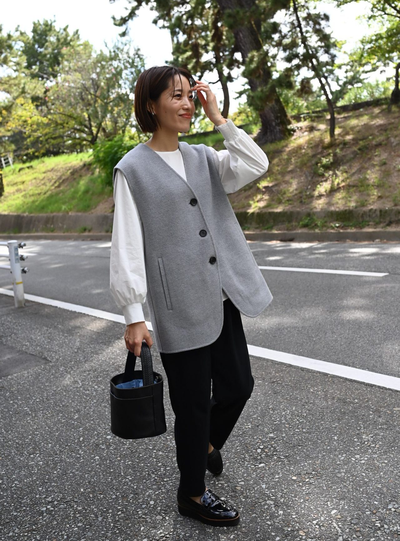 【ホワイト】スタッフ澤村/身長163cm「上質素材のあったかウールベスト(11月下旬発売予定)」「頼れるテーパードパンツ」「エナメルレザーのローファーシューズ」「こだわりレザーのポットバッグ」