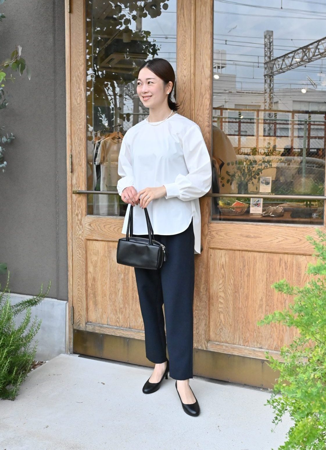 【ホワイト】Emi/身長164cm「セットアップで着られる洗えるタックパンツ」「艶やかレザーのキューブバッグ」「フォーマルに使えるレザーパンプス」「淡水バロックパールのネックレス」