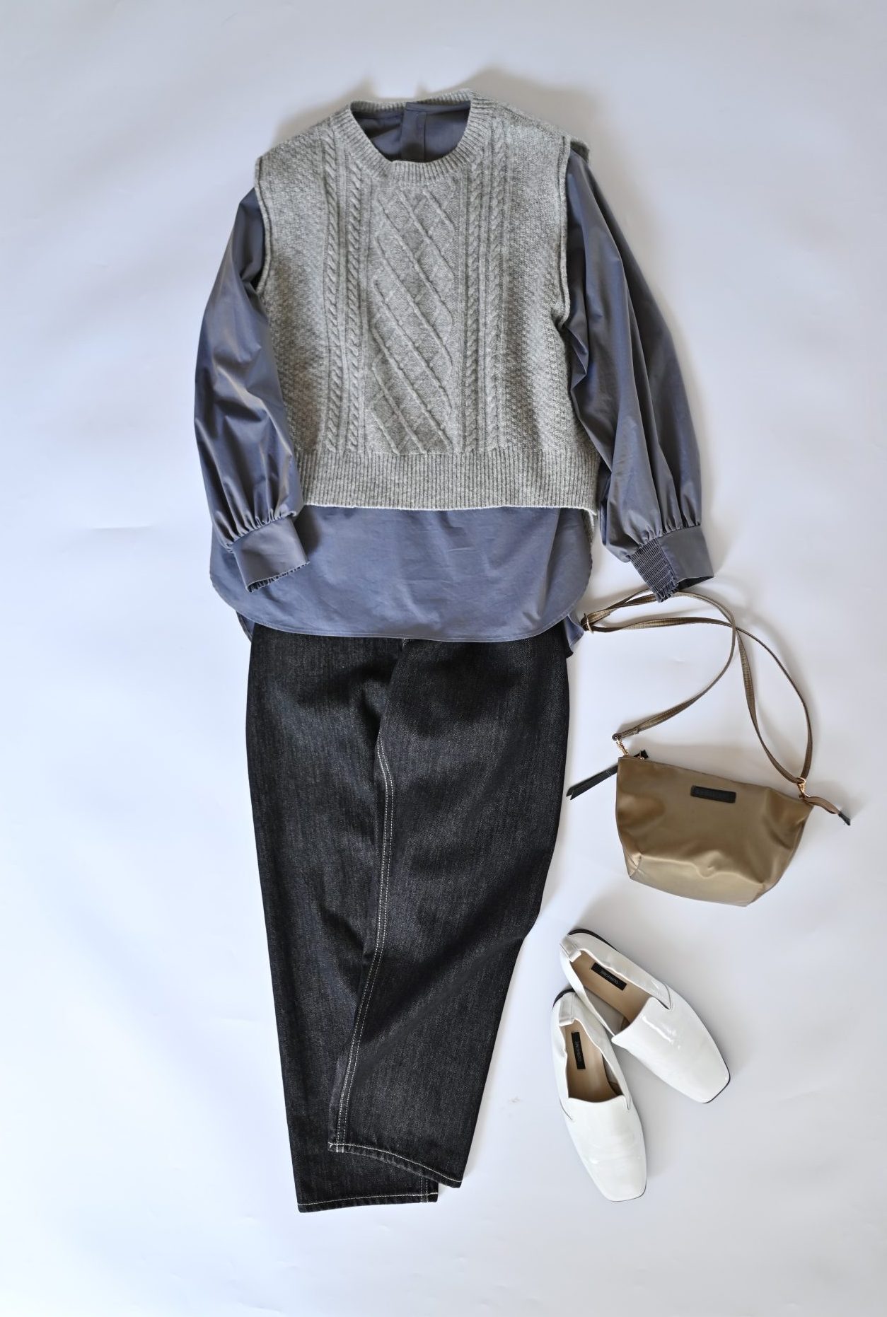 こんな風に、「柔らかウールのニットベスト」と合わせるのもおすすめ。