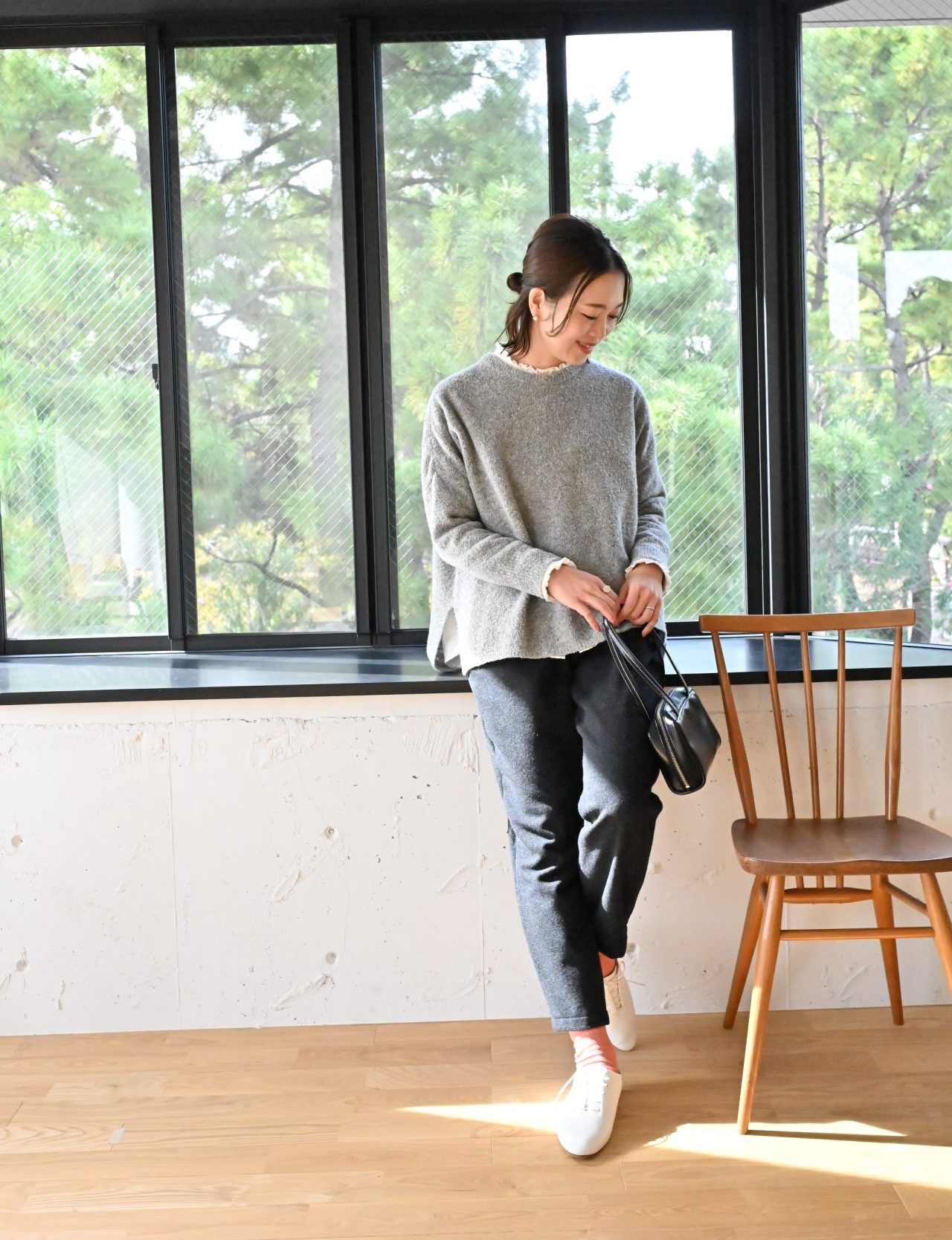 【杢グレー】Emi/身長164cm 「播州織のフリルブラウス」「ゆるテーパードの裏起毛あったかパンツ」「シアーラメ靴下」「エナメルレザーのローファーシューズ」「レザー持ち手のパンダショルダーバッグ」