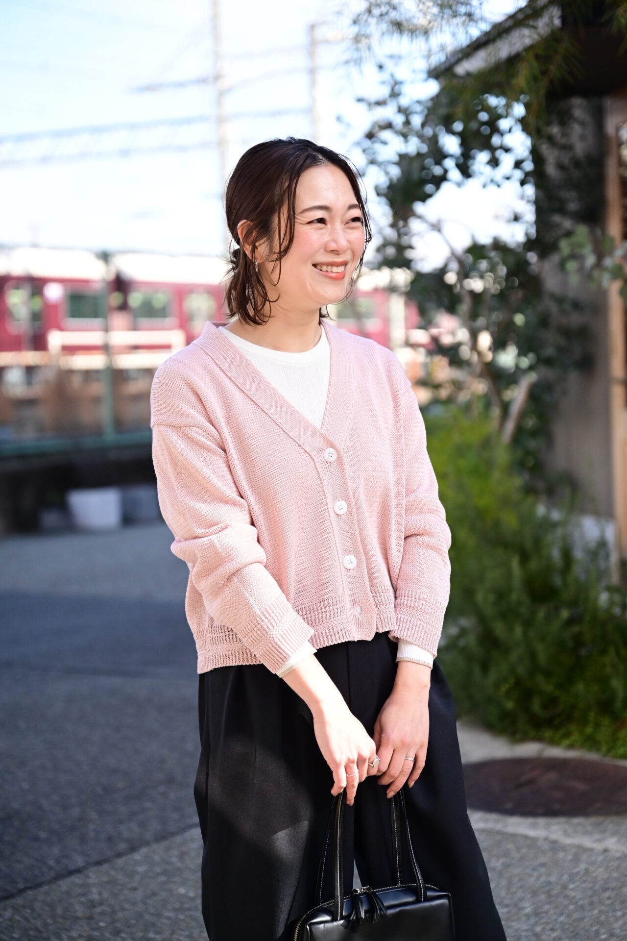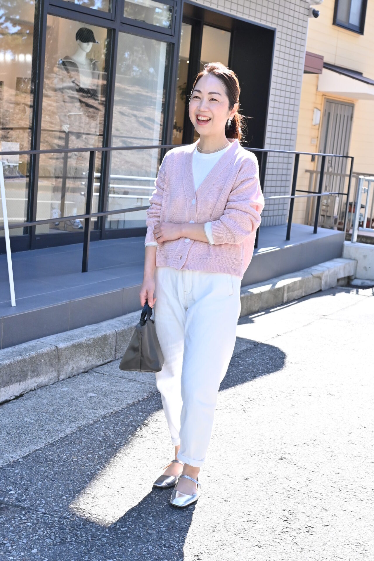 【ペールピンク】スタッフ横井/身長155cm「洗える配色アクセントのリブニット」「こだわりシルエットのデニムパンツ」「ナイロントートバッグ/medium」「大人に似合うストラップシューズ」