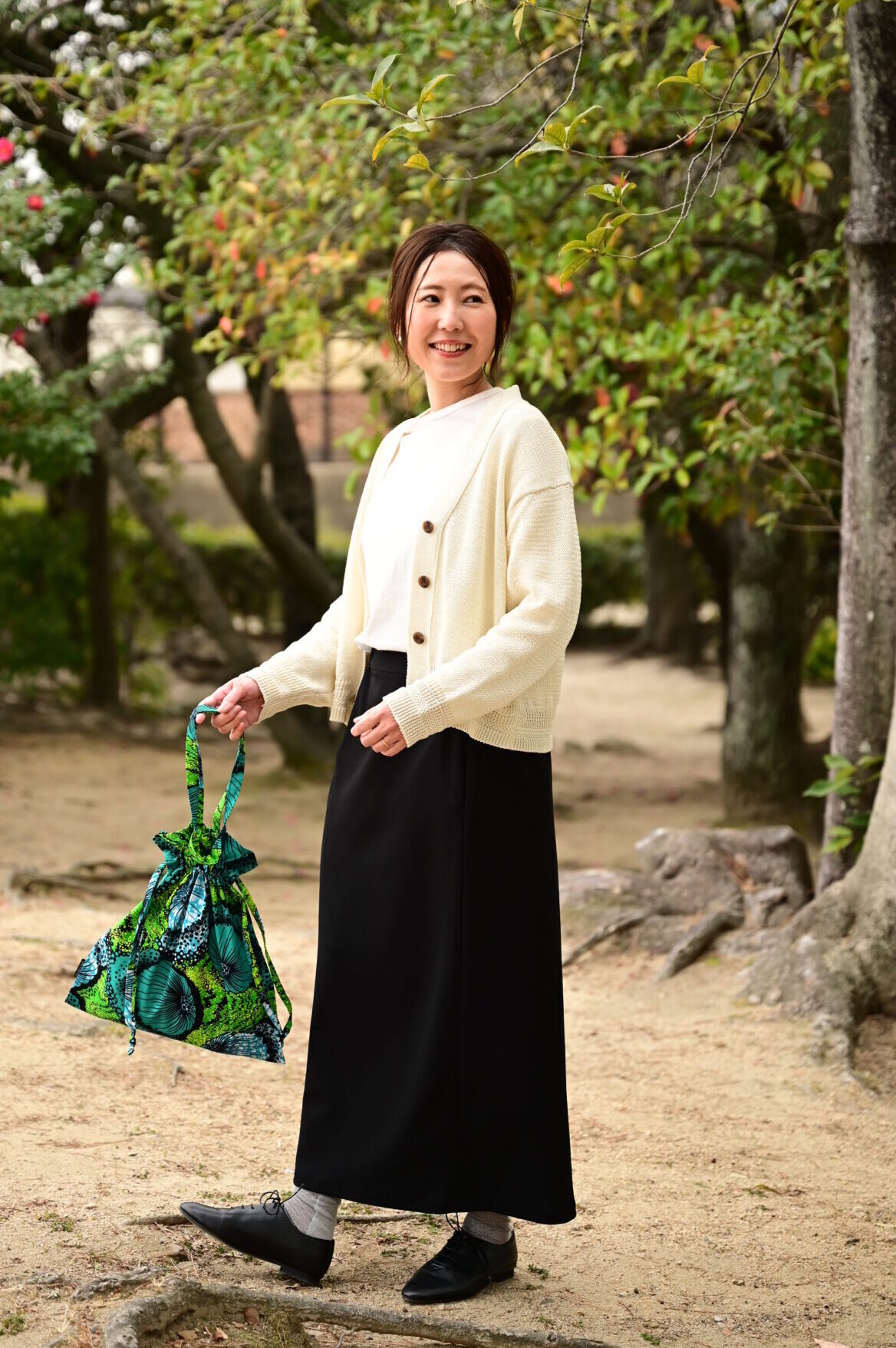 【オフホワイト】スタッフ杉本/身長164cm「クルーネック長袖カットソー」「アフリカパーニャ生地の巾着バッグ」「頼れるベーシックスカート」「マシュマロコンフォートシューズ」