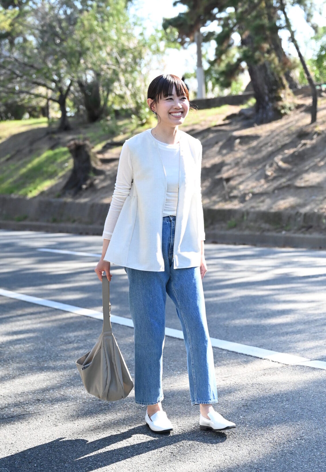 【杢ライトベージュ】スタッフ友廣/身長163cm「重ね着風カットソー」「こだわりシルエットのデニムパンツ」「エナメルスリッポン」