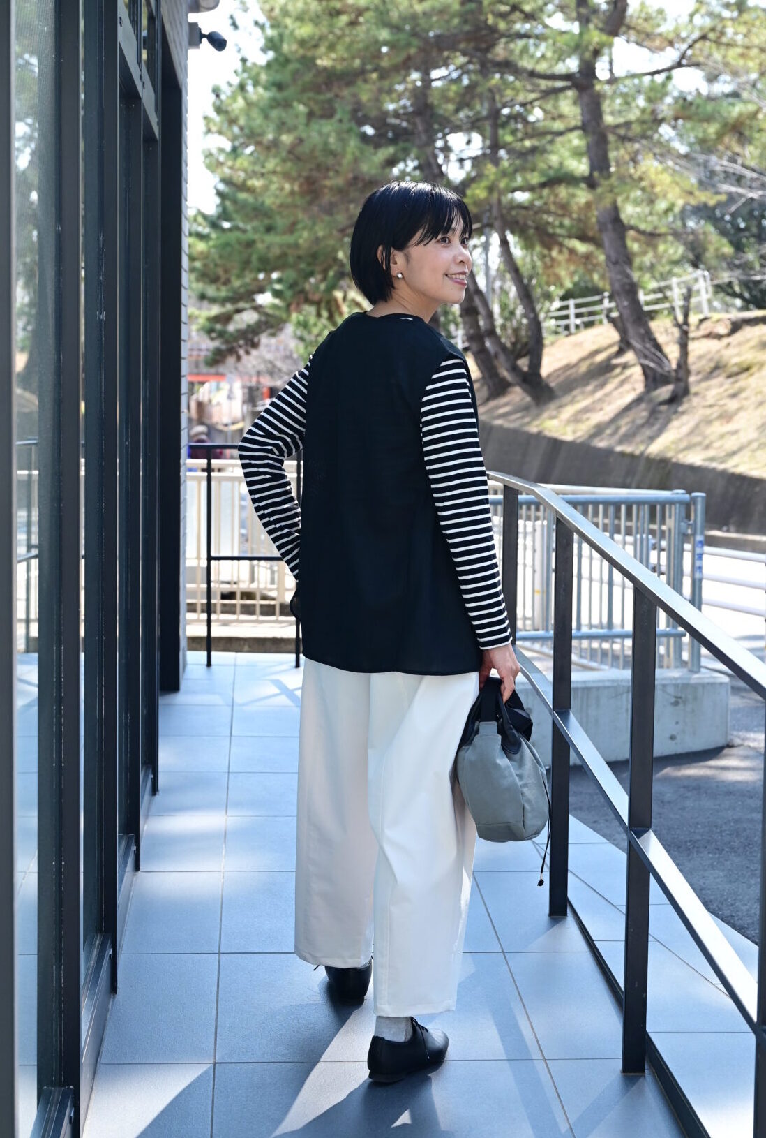 【ブラック】Emi/身長164cm「洗える配色アクセントのリブニット」「涼しくはけるテーパードパンツ」「マシュマロコンフォートシューズ」「フィットショルダーバッグ」「アフリカパーニャ生地の巾着バッグ」