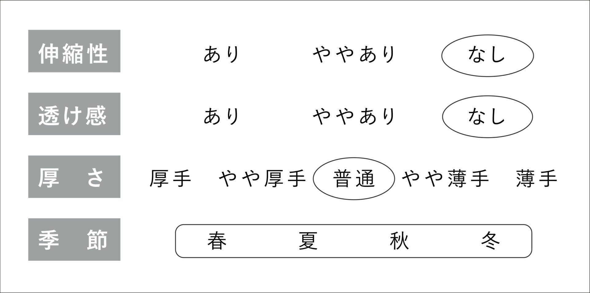 ちょうどいい厚みのポリエステル100%素材でシワになりにくく、お洗濯後のお手入れもラク◎