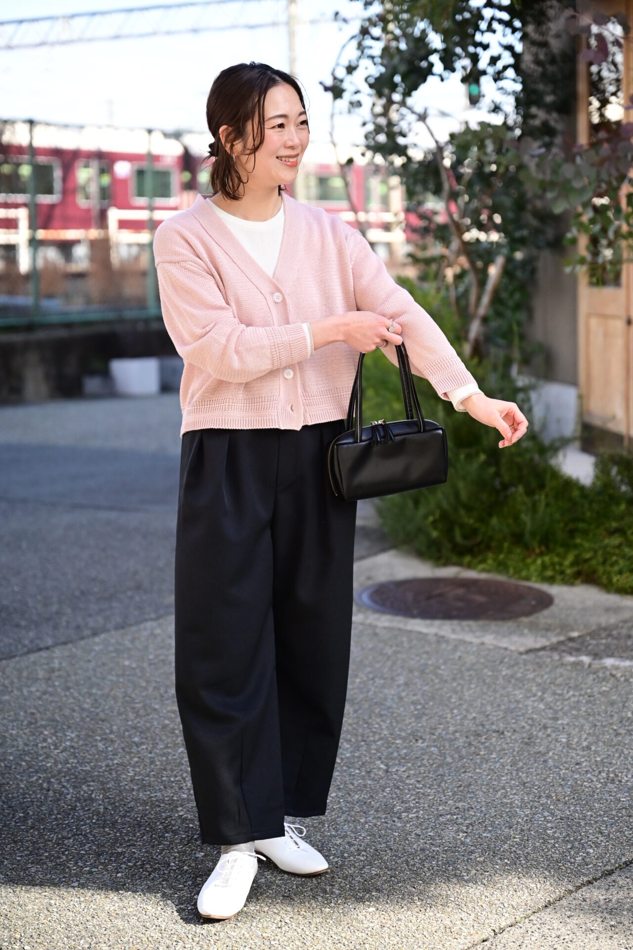 【ブラック】Emi/身長164cm「洗えるざっくりコットンニットカーデ」「洗える配色アクセントのリブニット」「マシュマロコンフォートシューズ」「艶やかレザーのキューブバッグ」