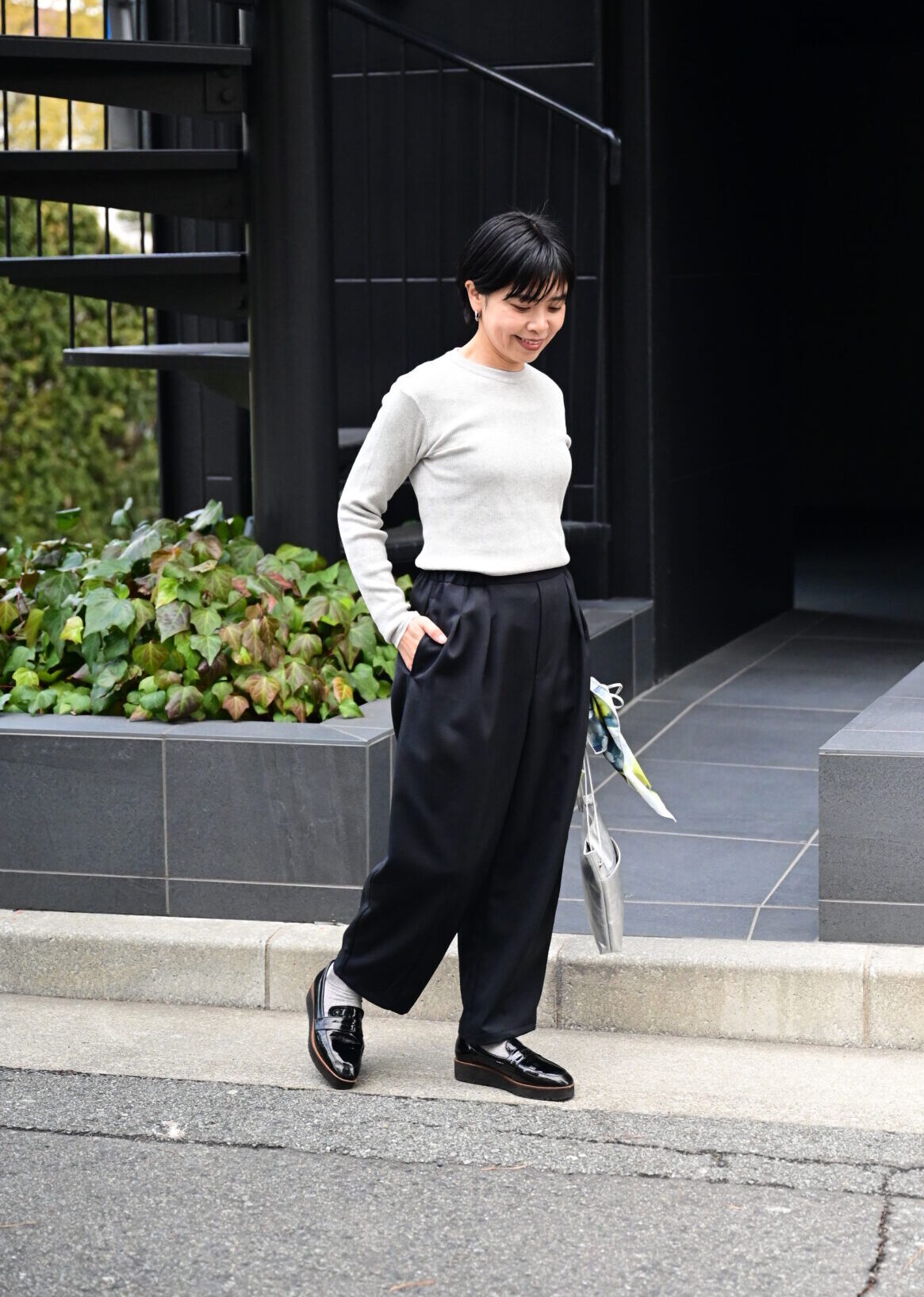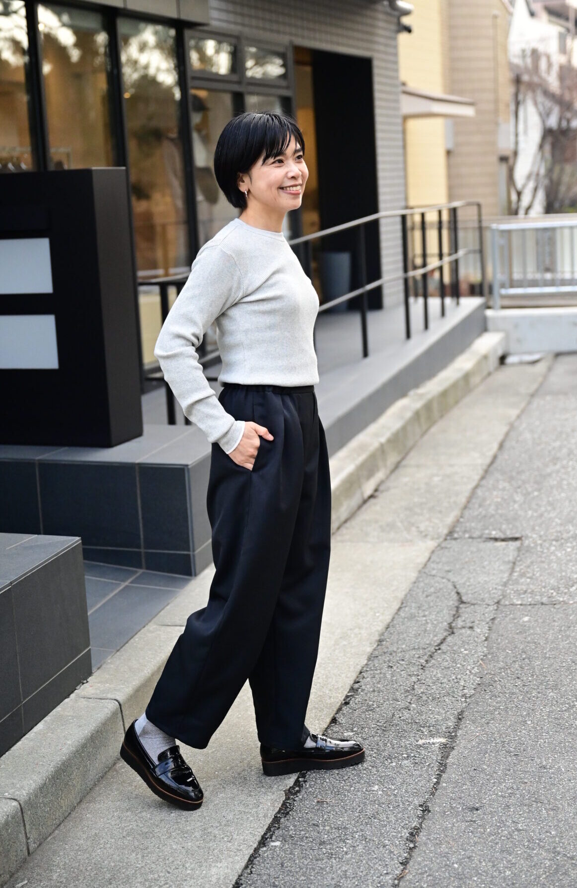 スタッフ黒田/身長158cm「洗える配色アクセントのリブニット」「エナメルスリッポン」「シアーラメ靴下」