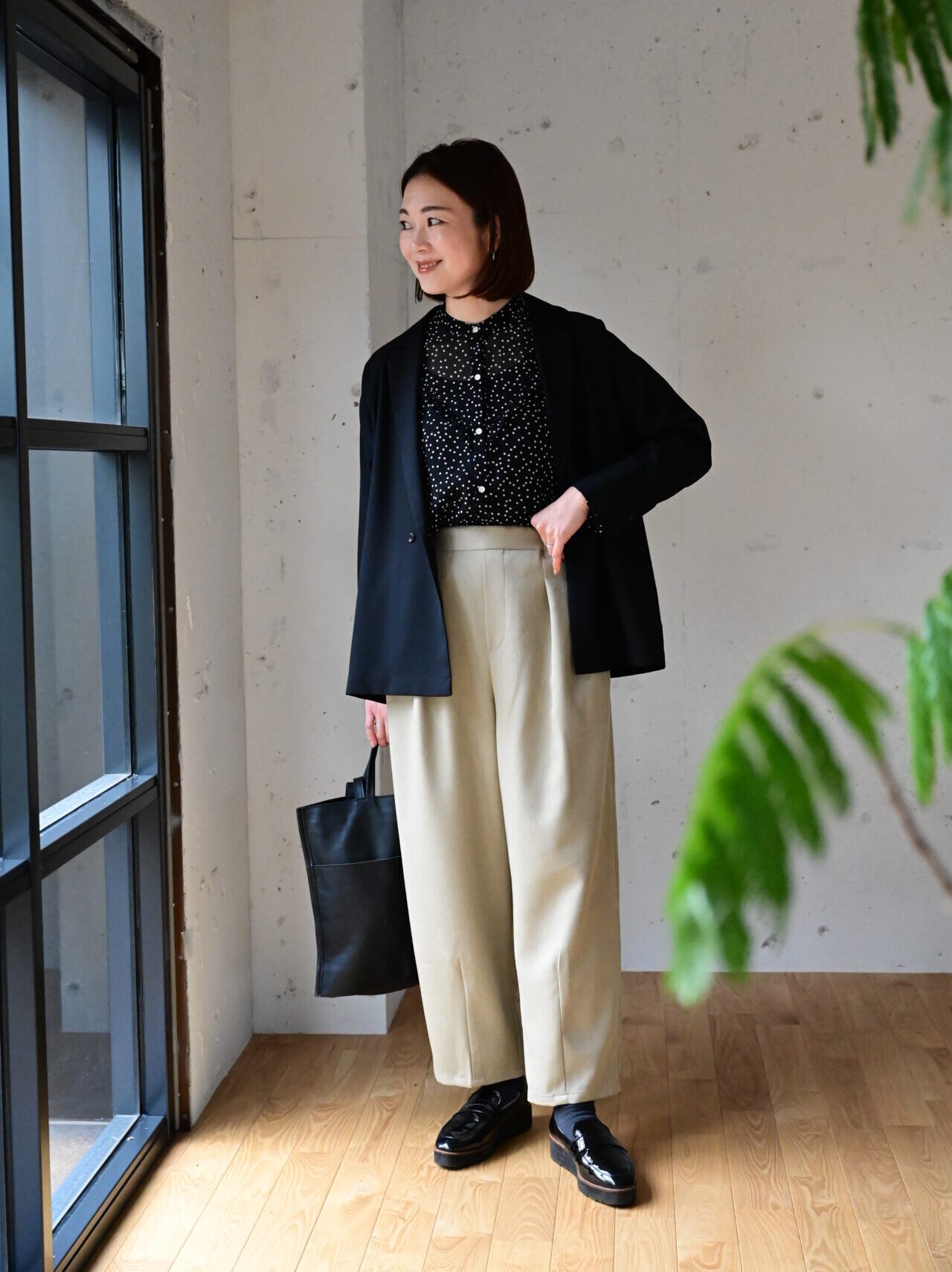 【ベージュ】「洗える軽やかジャケット」「シフォンドットブラウス」「エナメルスリッポン」「2WAYフィットトートバッグ」