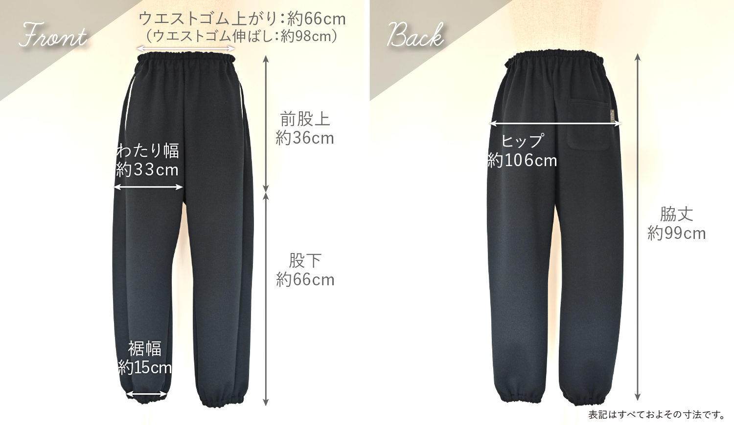 ウエストはラクに過ごせるゴム仕様&ひもで調節OK