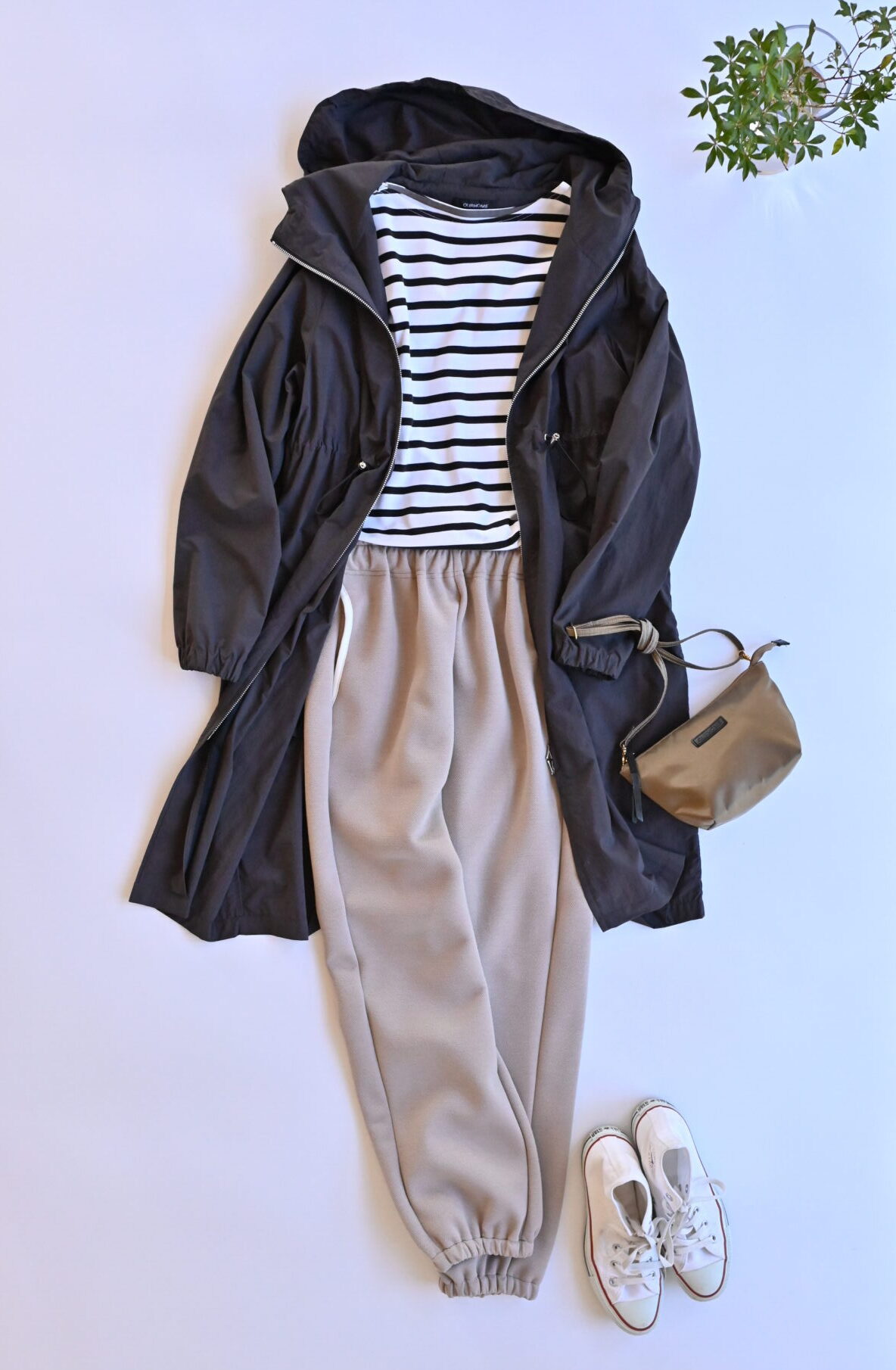 「撥水素材のダブルジップコート」「綿100%の長袖ボーダーカットソー」「ナイロンショルダーバッグ/mini」