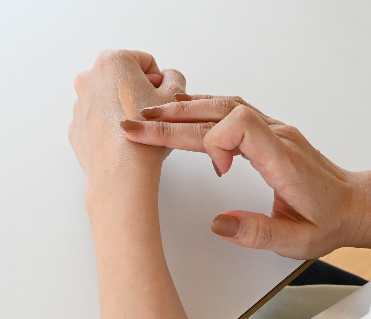 【トーンアップUVクリーム】【クリームファンデーション】【フェイスパウダー】を塗った左手と比べるとこのように。