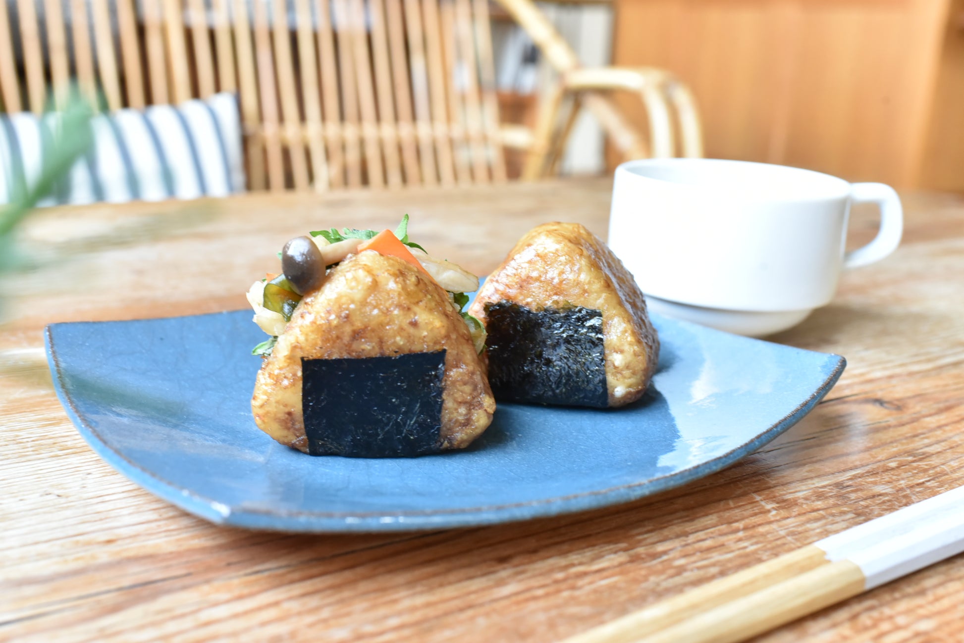 玄米揚げおにぎりは圧力鍋で炊いた玄米を1日寝かせ米油で揚げ、お醤油にくぐらせ表面はカリっと、中はもちっとした新食感。